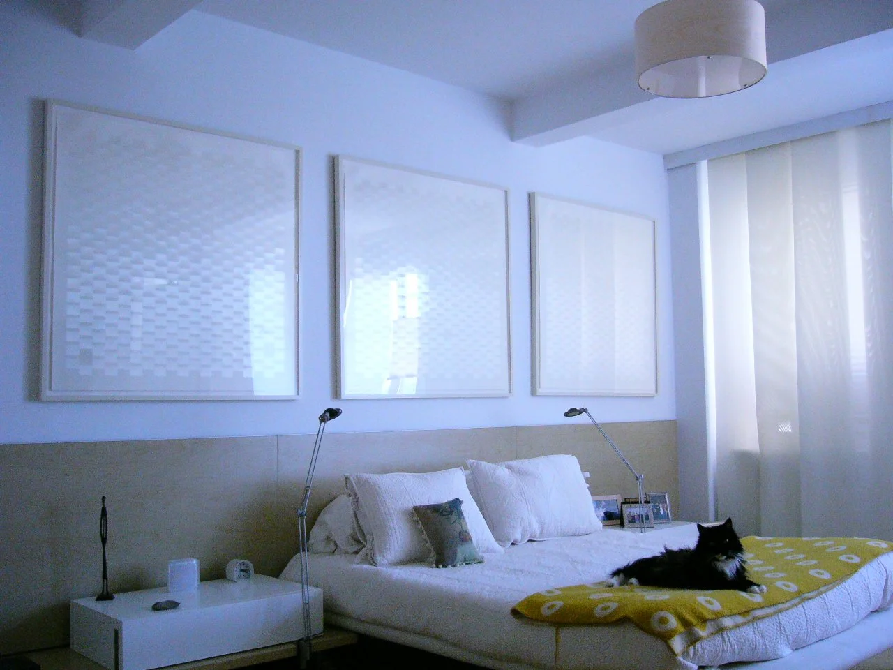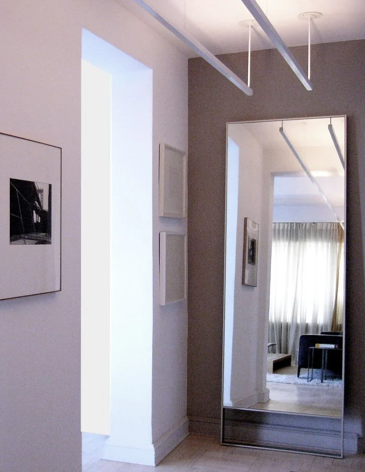 The building regulations covering this large rental apartment did not allow for any major construction or demolition. But the client wanted the space to have a more open feel and a more elegant procession from room to room. In order to achieve the client’s goals, I used a carefully curated selection of wall colors, lighting, and built-ins. The apartment adhered to a minimalist design while projecting warmth through the use of an earthy overall color palette, sheer fabric curtains, and plush carpeting. Another intervention involved installing two rows of uplighting to connect the living room with the entry foyer. The effect was to integrate the disparate existing spaces and gently extend the gaze from the entryway into the living room. Additional elements, such as the flexible, angled mirror and a reflective glass panel, helped reshape the apartment without adding or demolishing walls.