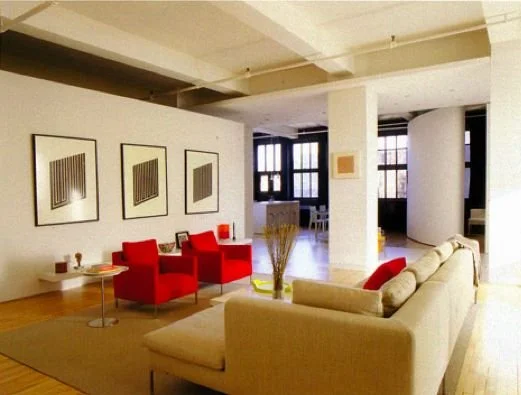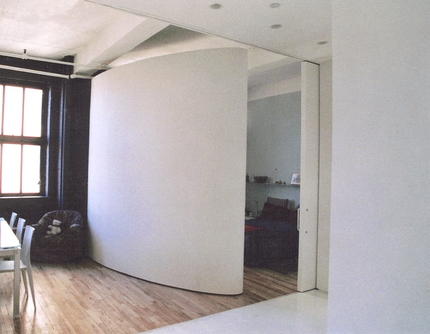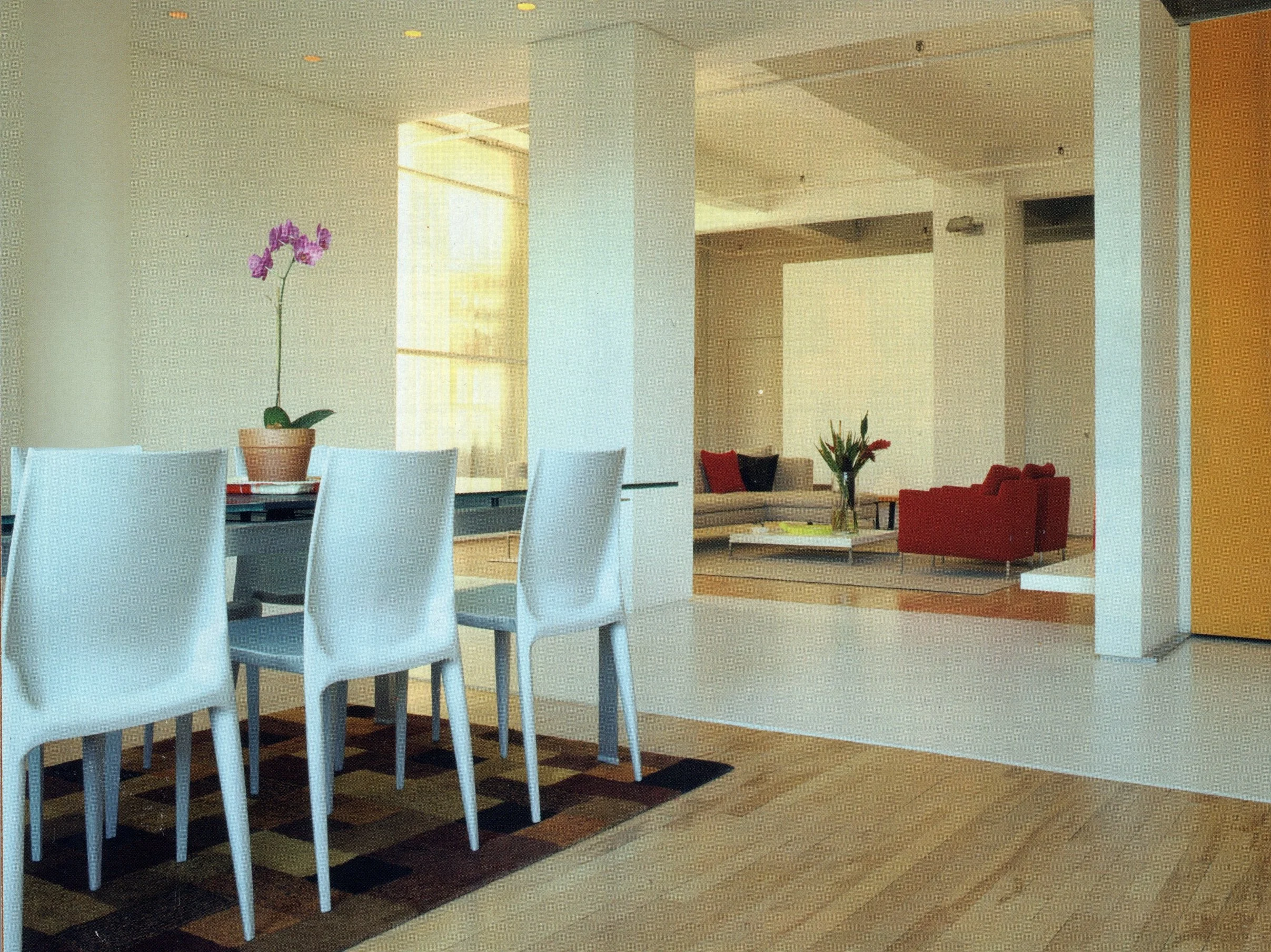 Originally a large, high-ceilinged raw loft with a row of windows along two sides, the challenge was to create spatial variation and layered interiority. An atrium solution was found, with the living room surrounded by two smaller, glass-paneled rooms that permitted light to filter in from the exterior windows into the atrium. At the far end of the living area, a band of white flooring created a threshold separation between the living and dining areas. A dropped ceiling with multiple lighting intensity options allowed the space to be defined in different ways. Floating walls gave the space a gallery feel to display the client’s collection of art, architectural drawings, and photographs.