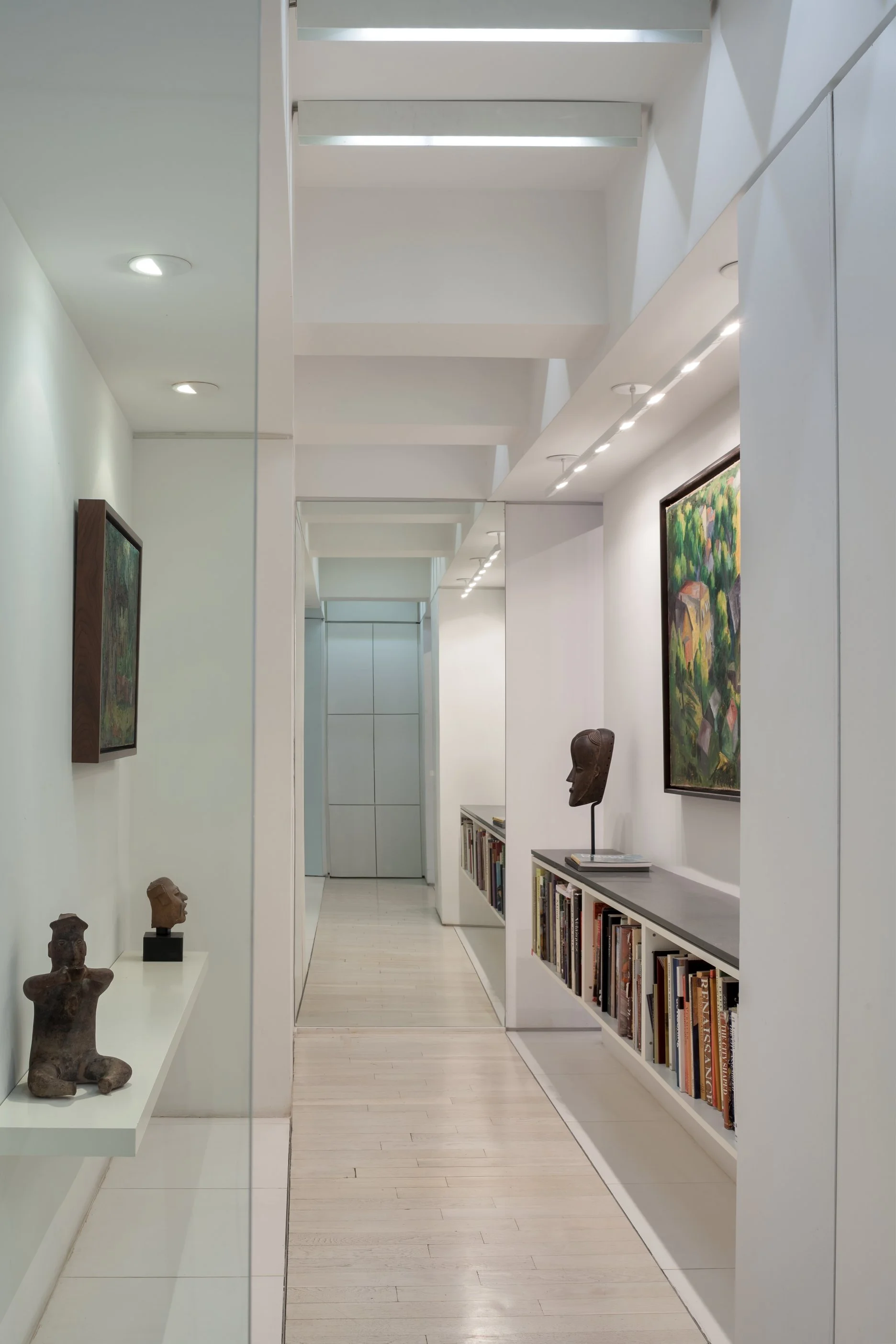 The living area also featured a floating light box that registered as a minimalist sculpture. The box was clad in a translucent material that allowed it be used as a screen for TV projection. It also doubled on the other side as a bookshelf unit. Ceiling beams were illuminated throughout to give the walls a floating feel, and the hallway ceiling was lined with beads of light that drew the eye upwards. The hall passageway contained low shelving for the display of sculptures and books.