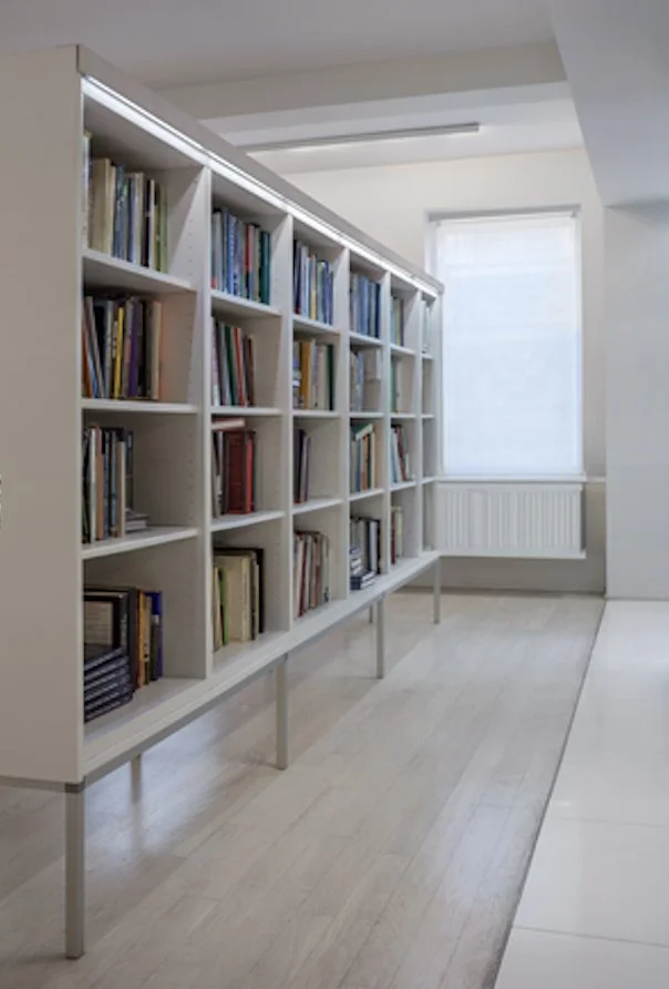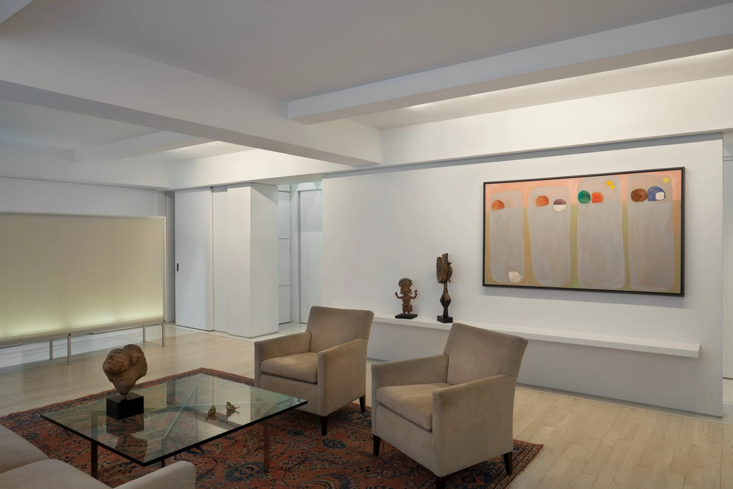 This prewar apartment belongs to two psychologists who wanted clearly defined spaces for books, art, and separate offices. The solution was to create hidden “satellite” zones using low walls within a larger open living space.