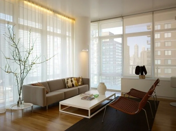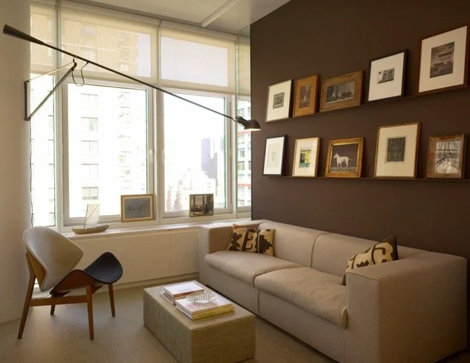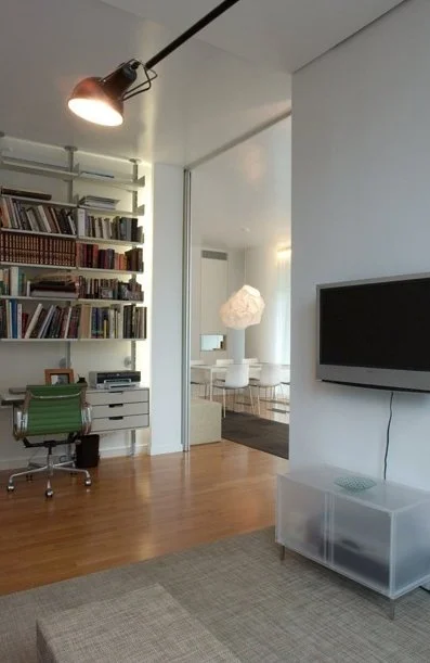 This small apartment originally featured a large, boxy room that, while filled with light, lacked character and a sense of scale. To enhance the space, we created options for connecting the living area to the adjacent den.
