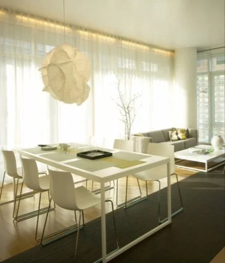 This involved removing an existing wall and adding a large sliding door. The client, a manufacturer of placemats and rugs, contributed a long runner that connected the living and dining areas. Fanciful design features – light fixtures, materials, mirrors, and a careful choice of modern furniture - gave this apartment a stylish and functional facelift.