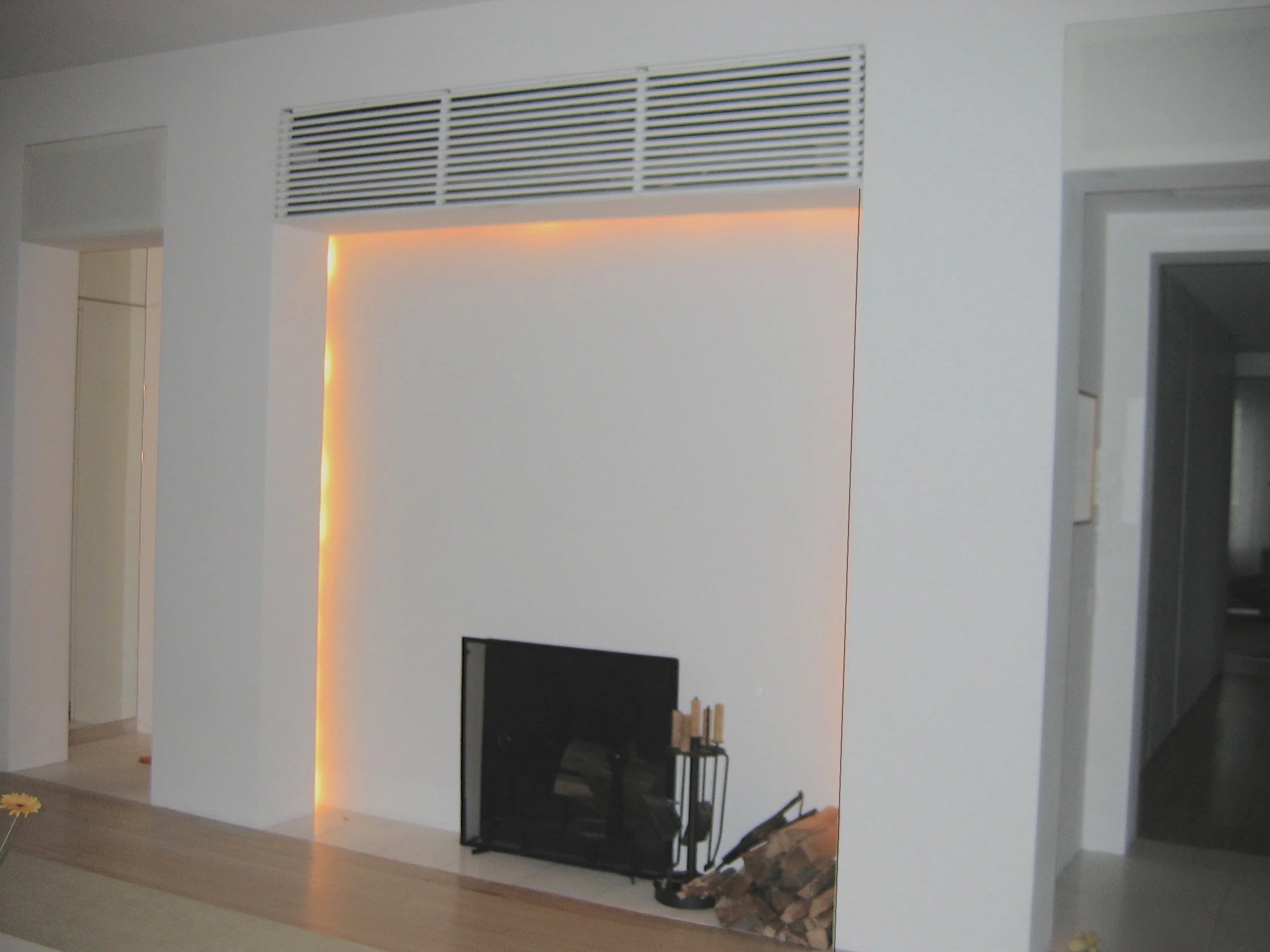 The wall was framed by a symmetrical arrangement of doors and square openings that amplified the importance of the firebox. To reinforce this composition, speakers were integrated above the door opening, with the HVAC grille centered above the fireplace aperture.