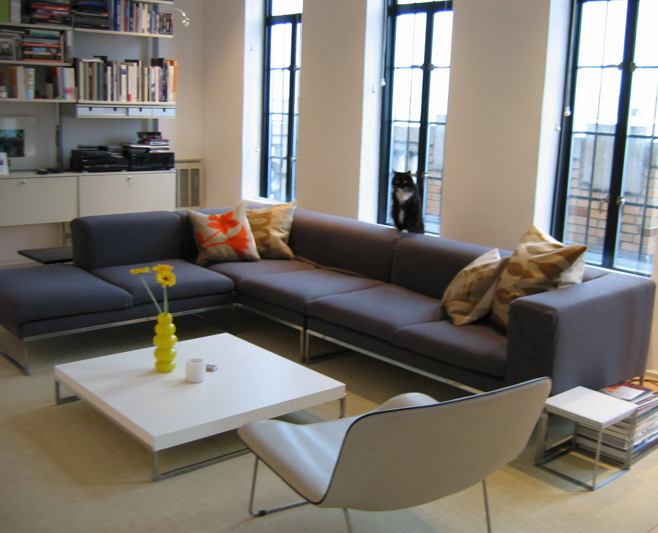 The original steel windows echoed the square, rectangular geometries of the fireplace, creating a visual language that was repeated at strategic moments throughout the apartment.